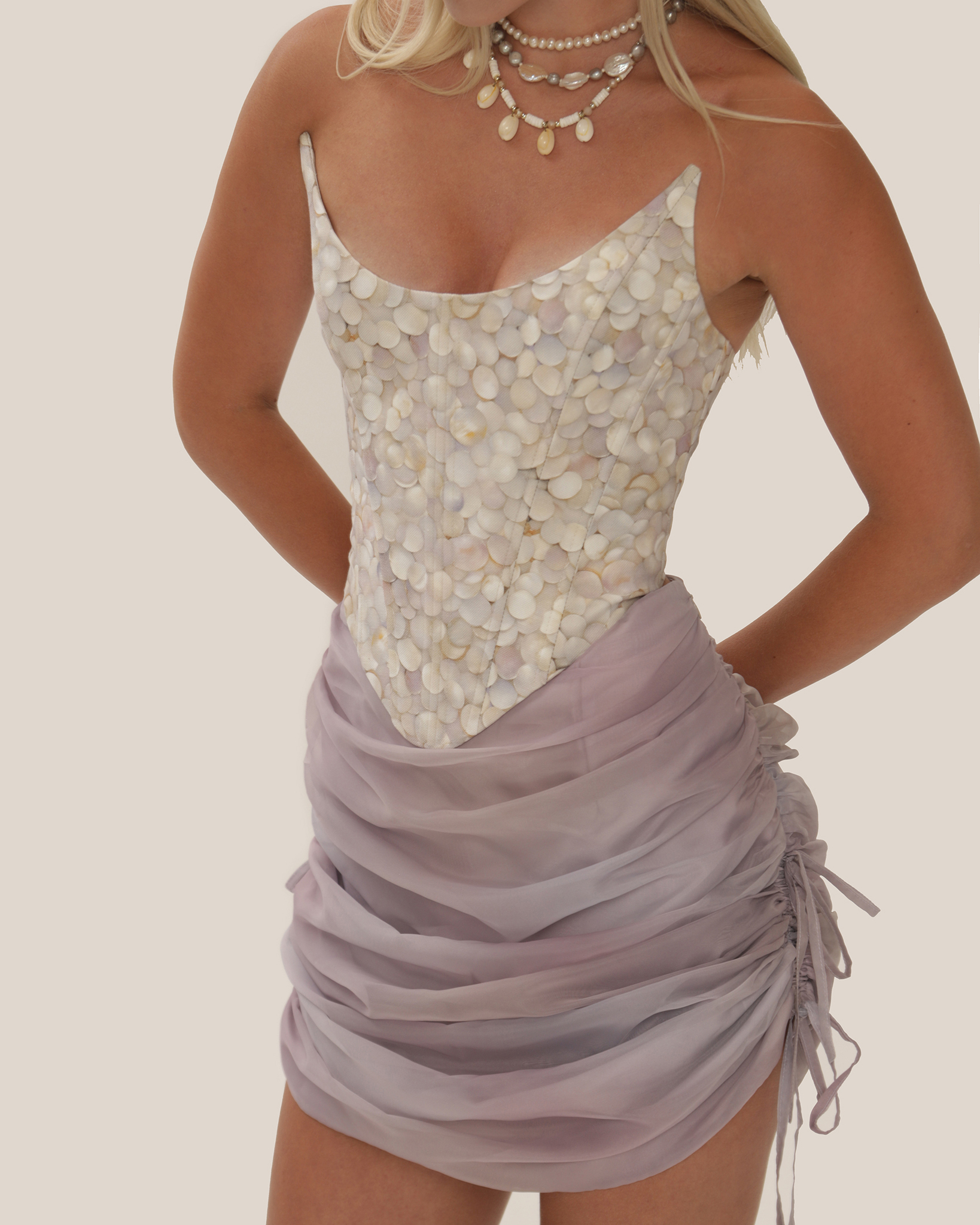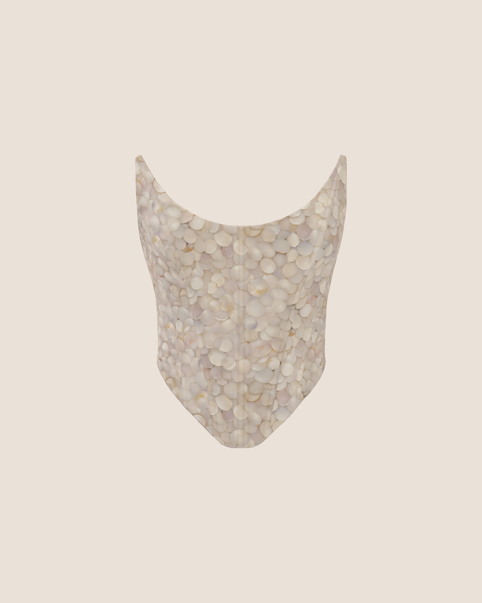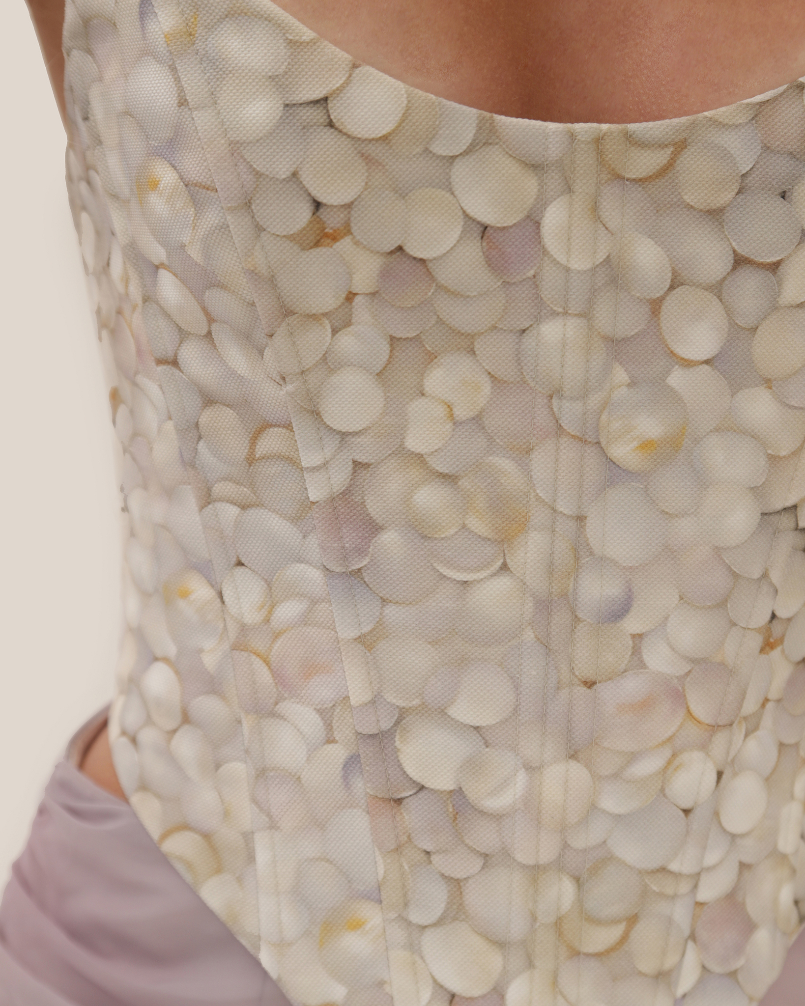 Корсет с фигурным вырезом из хлопкового пике с принтом "Ундина". Вырез на груди создает эффект push-up, а косточки поддерживают и корректируют силуэт.