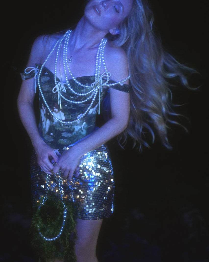 Корсет с завязками на груди и на лямках с принтом «Нимфы», выполненный из джинсы.